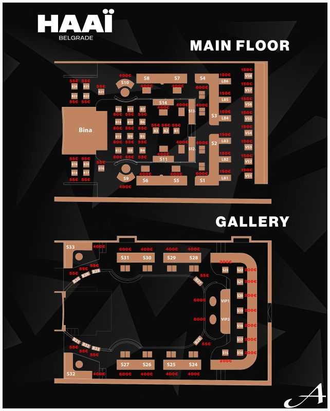 Rezervacije: Barski sto - 55€ (uključuje 1 flašu vina), minimum potrebno 4 karte za rezervaciju VIP barski sto - 80€ (uključuje 1 flašu Prosseca), minimum potrebno 4 karte za rezervaciju Lux barski sto - 150€ (uključuje 1 standardnu flašu žestine), minimum potrebno 5 karata za rezervaciju Visoko sedenje - 150€ (uključuje 1 standardnu flašu žestine), minimum potrebno 5 karata za rezervaciju Lounge - 200€ (uključuje 1 premium flašu žestine), minimum potrebno 4 karte za rezervaciju VIP Lounge - 400€ (uključuje 1 premium flašu žestine i 1 Moet Imperial), minimum potrebno 8 karata za rezervaciju Lux VIP Lounge - 600€ (uključuje 1 premium flašu žestine i 1 Moet), minimum potrebno 8 karata za rezervaciju