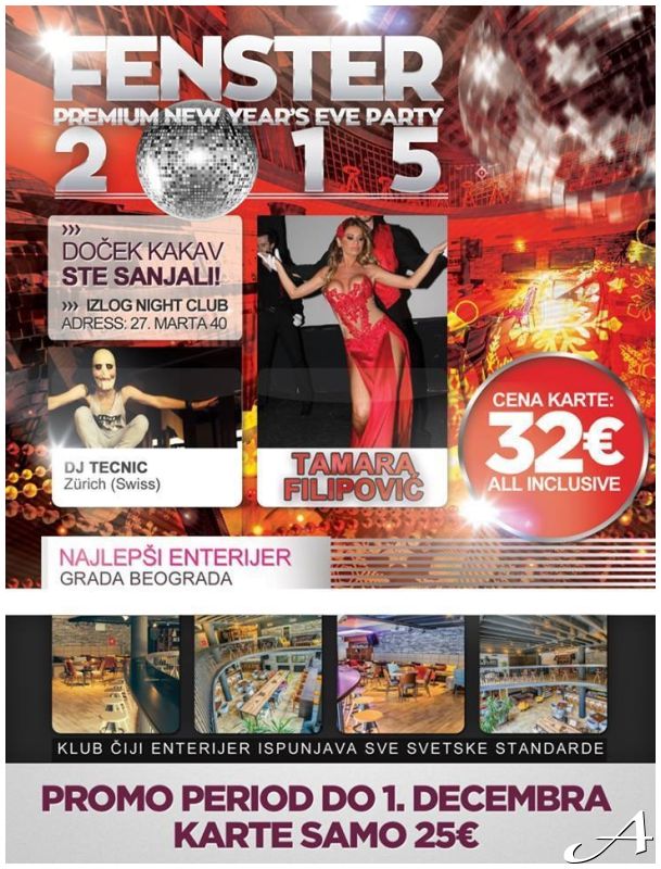 Dočekajte Novu Godinu u fenomenalnom ambijentu kluba IZLOG u samom centru Beograda. Lokal koji se prostire na 2 nivoa, uz sjajan nastup Tamare Filipović garantuje odličan novogodišnji provod. Novogodišnji doček poznat i pod nazivom Fenster 2015. Najmoderniji i najlepsi enterijer u gradu koji ispunjava sve svetske standarde ...Doček kakav ste sanjali!