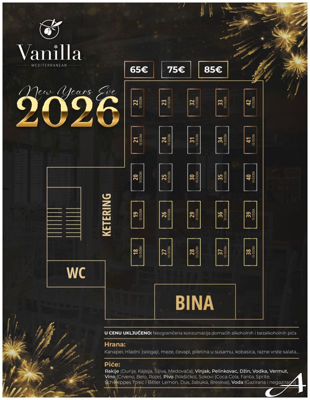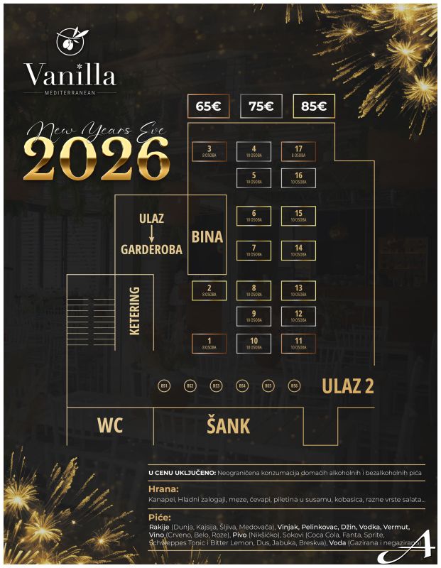 Za doček Nove godine 2026. biće obezbeđena kombinacija muzike uživo i DJ seta, tako da gosti mogu da očekuju večeru punu energije i raznovrsnog zvuka. Vanilla je poznata i po tome što nudi jednu od najbogatijih all-inclusive ponuda među klubovima: osim pića, posetioci će imati priliku i da se okrepe hranom tokom večeri, potpuno besplatno. Uz rezervacije se dobija i ubedljivo najveći izbor gratis pića, što ovaj klub čini veoma privlačnom opcijom za novogodišnje slavlje.