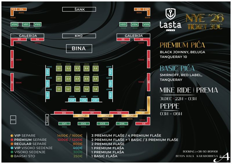Smešten na jednoj od najatraktivnijih beogradskih lokacija, u Karađorđevoj 2-4, klub Lasta kombinuje duh prestonice sa modernim RnB, house i pop ritmovima, stvarajući scenu za proslavu Nove godine koja će zadovoljiti i najzahtevnije ljubitelje noćnog života.