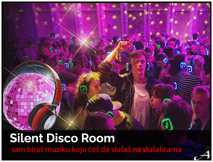 Silent Disco roomOvaj stejdž je manjeg kapacitet do 120 ljudi. Namenjen je za one koji u društvu imaju prijatelje sa različitim muzičkim interesovanjima i nikad ne mogu da se dogovore šta će da slušaju. Na ulaza u stejdž dobijate slušalice na kojima možete da birate tri različita kanala sa tri različte muzike, tako da pored sebe možete imati prijatelja koji sluša AC DC a kod vas da gruva Sinan i svi se lepo provodite.