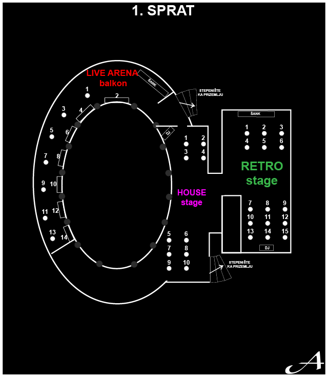 StejdževiSve to možda ne bi bilo tako zanimljivo da se, gore objašnjeno, muvanje, zezanje, đuskanje i ostalo ne dešava na 4 sjajna stejdža. Svi stejdževi su fizički odvojeni i međusobno povezani. Sa istom ulaznicom možete da idete gde god vam odgovara. Žurka počinje u 20h i završava se u 04h!