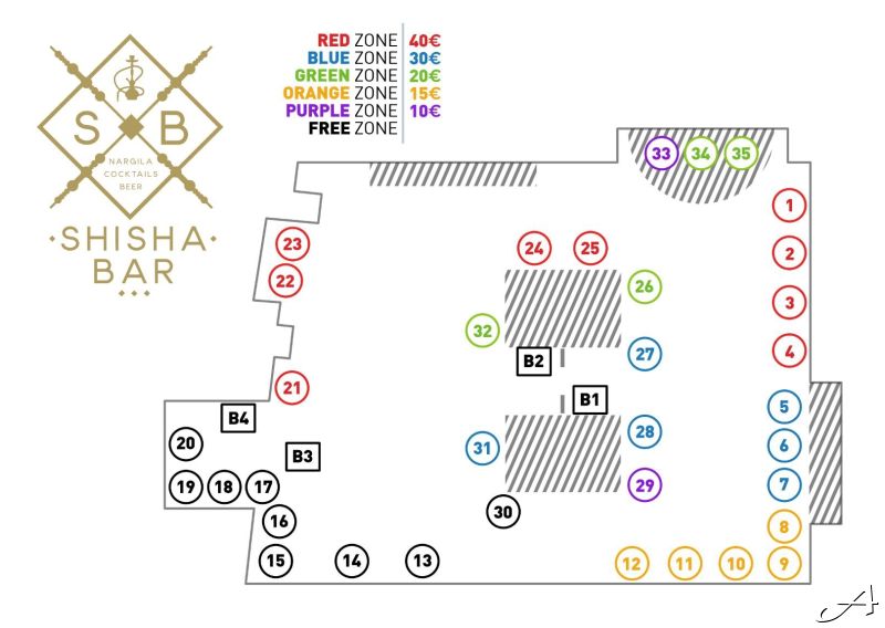 Red zone - 40€ Blue zone - 30€ Green zone - 20€ Orange zone - 15€ Purple zone - 10€ Free zone