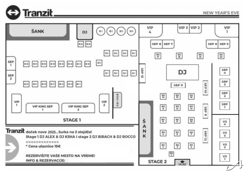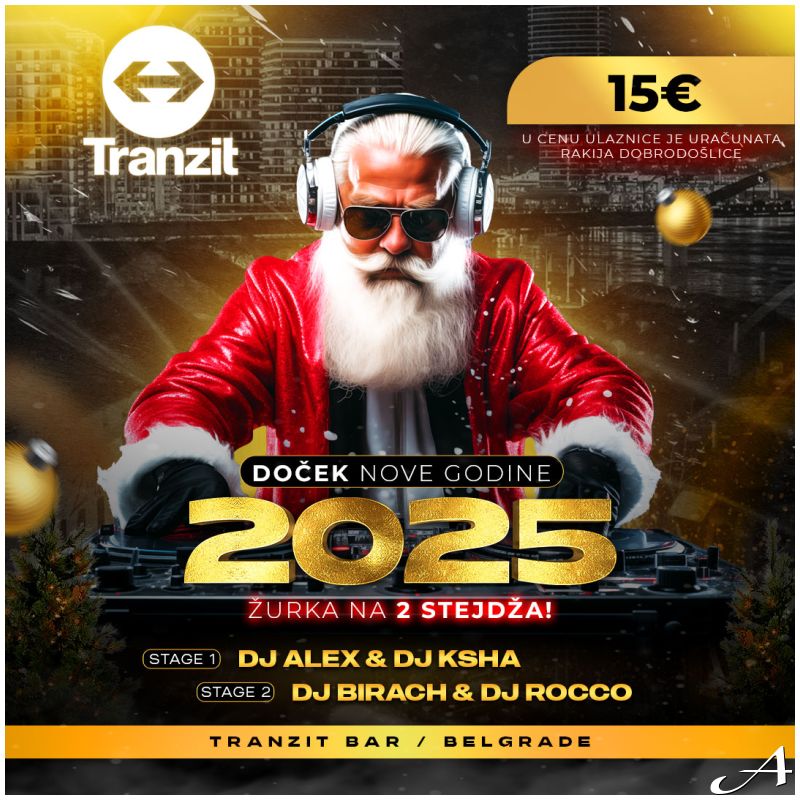Poznat po nezaboravnim žurkama i energičnoj atmosferi, Tranzit je idealno mesto za ljubitelje house i deep house muzike, dok će ljubitelji disco i funk ritmova takođe uživati u posebnim segmentima večeri. Svaki detalj je osmišljen kako bi doček bio ležeran, ali nezaboravan.