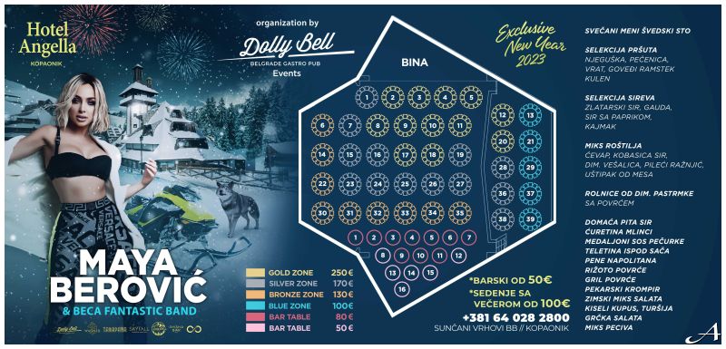 Nova godina 2023 - Hotel Angella KopaonikBliži se najveselija noć u godini, a u hotelu Angella Kopaonik će specijalno za ovu priliku nastupiti jedna od najvećih muzičkih zvezda sa ovih prostora, Maya Berović. Ovaj nastup biće jedan od centralnih muzičkih i zabavnih sadržaja ove zimske sezone na Kopaoniku, a za organizaciju je zadužena ekipa iz