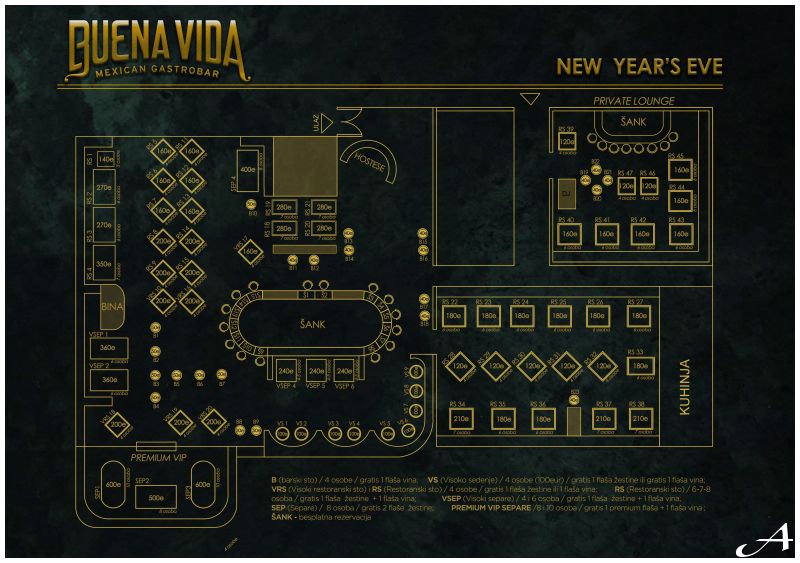 Rezervacije se posebno doplaćuju (sem mesta za šankom) : Šank sa barskom stolicom - besplatna rezervacija Barski sto sa 2 barske stolice - od 40€ (gratis flaša vina) Visoko sedenje - 100€ (gratis flaša vina) Restoranski Stolovi za 4 osobe - od 120€ (gratis flaša žestine ili vina) Restoranski stolovi za 6-7 osoba - od 180€ (gratis flaša žestine ili vina) Separe (restoranski sto) za 8 osoba - 400€ (2 gratis flaše žestine) Visoki separe za 4-5 osoba - 240€ (gratis flaša žestine i vina) Visoki separe za 6 osoba - 360€ (gratis flaša žestine i vina) Premium Vip separe za 10 osoba - 600€ (gratis flaša premium žestine i flaša vina)