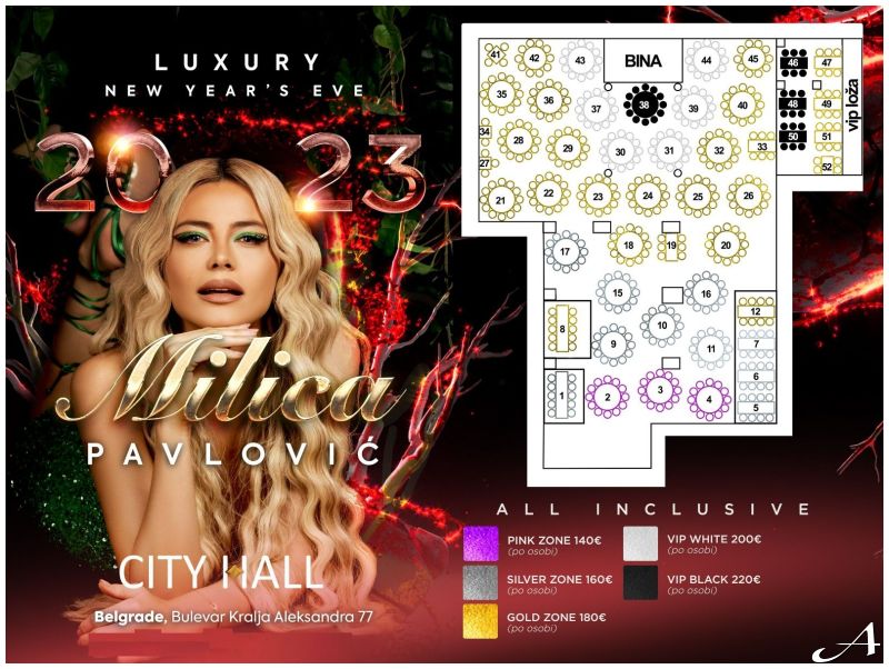 Cena po osobi se kreće od 140€ do 220€ u zavisnosti od pozicije stola u samoj sali i uključuje elegantno mesto za sedenje, kompletnu večeru i neograničenu konzumaciju alkoholnih i bezalkoholnih pića tokom cele večeri (vidi na mapi, klikni na mapu za uvećan prikaz).