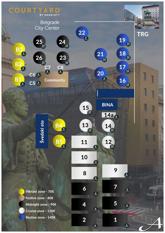Skyline zone - 140€ Podrazumeva mesto za banket svečanim stolom na prestižnoj poziciji kraj staklenog portala sa magičnim pogledom na trg republike. All-inclusive konzumacija hrane i pića prema novogodišnjem meniju