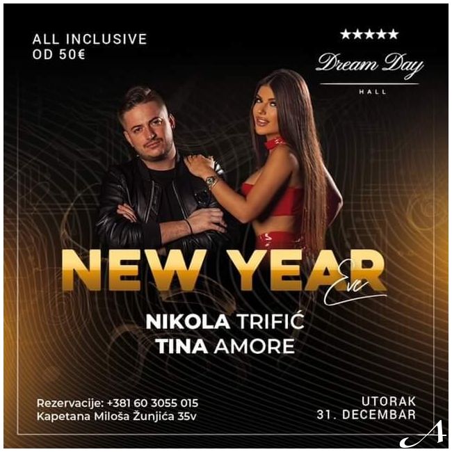 Šta vas očekuje? - Specijalni novogodišnji meni All inclusive - Uživajte u gurmanskim delicijama pripremljenim od najkvalitetnijih sastojaka. - Muzika uživo - Fantastični Nikola Trifić i Tina Amore će vas zabavljati tokom cele noći, stvarajući atmosferu savršenu za ples i uživanje. - Povoljni paketi - Prilagođeni paketi za vašu savršenu proslavu, sa bogatim jelima, pićem i izuzetnim uslovima.