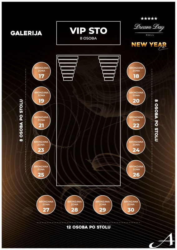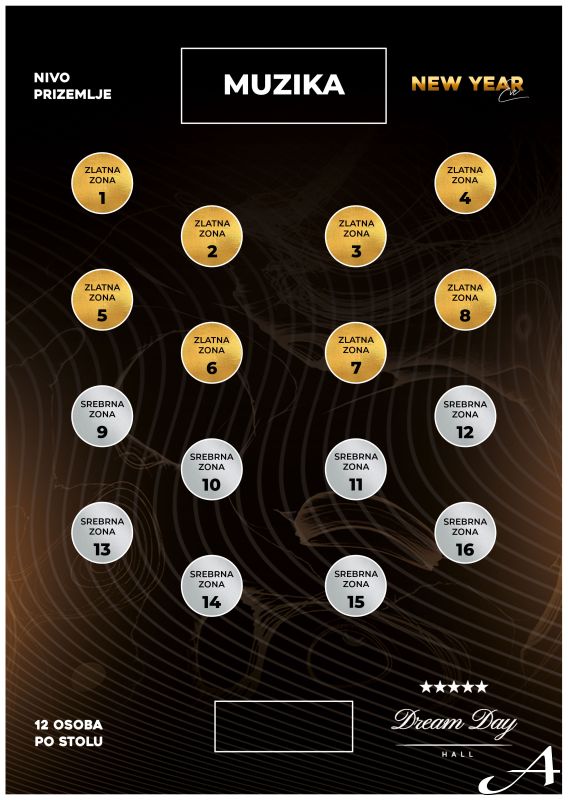 Cena karte po osobi kreće se od 50€ do 80€, u zavisnosti od pozicije (zone) stola u sali (Pogledati mapu sedenja). Sva mesta podrazumevaju uslugu All inclusive, sedenje za banket stolom, kompletnu svečanu večeru, kao i neograničenu konzumaciju bezalkoholnih i alkoholnih pića navedenih u ponudi i besplatan parking.