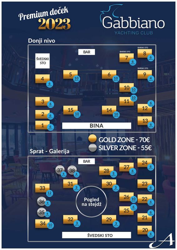 70€ - Gold zonePodrazumeva bolje pozicije u sali i All-inclusive konzumacija hrane i pića prema novogodišnjem meniju