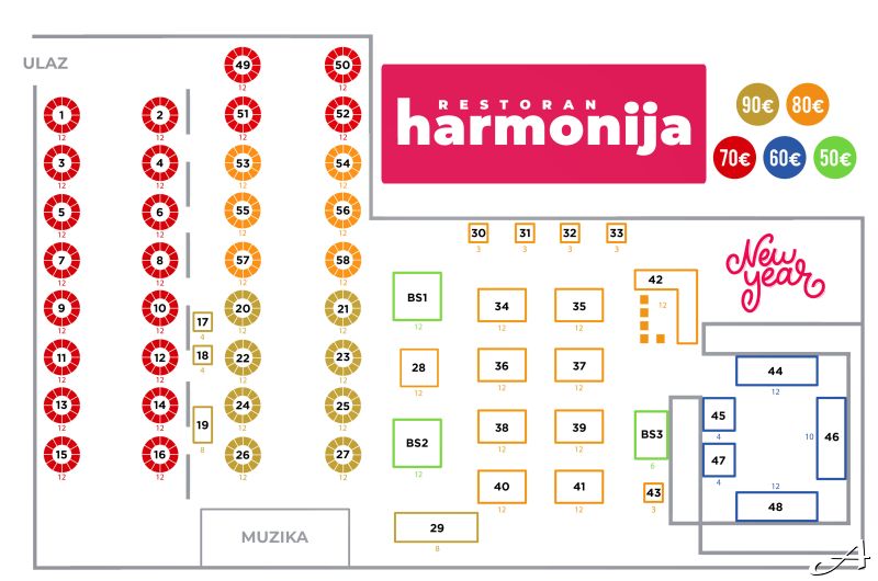 *Napomena: Orijentaciona mapa prostora. U skladu sa novogodišnjom postavkom sale, moguća su manja odstupanja u rasporedu stolova.
