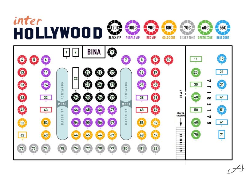Cena po osobi se kreće od 65€ do120€ u zavisnosti od pozicije stola u samoj sali i uključuje elegantno mesto za sedenje, kompletnu večeru i neograničenu konzumaciju pića tokom cele večeri (vidi na mapi).