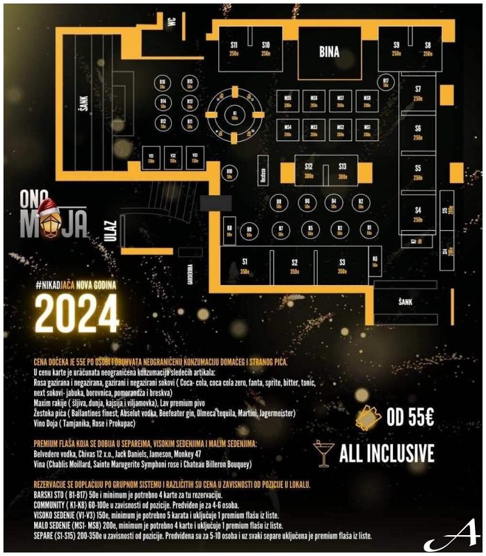 Separe (S1-S15) 200-350€ u zavisnosti od pozicije. Predviđena su za 5-10 osoba i uz svaki separe uključena je premijum flaša iz liste.