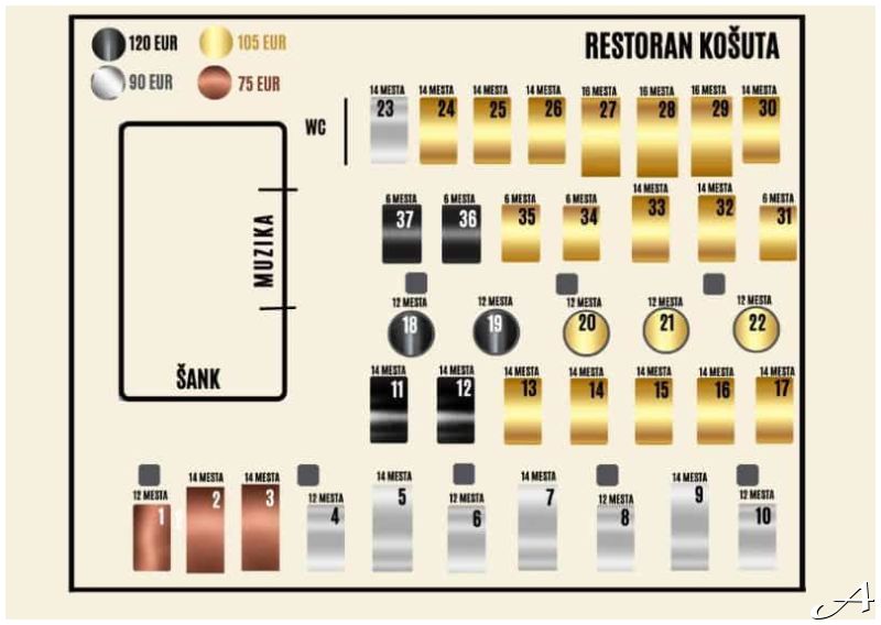 od 75€ do 120€.Cena zavisi od pozicije stola (videti na mapi ispod)