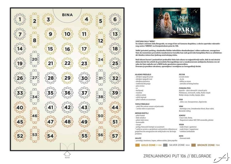 Daćemo sve od sebe da vam najluđa noć u Neri bude apsolutno neponovljiva. Dvorana je posebno ukrašena, opremljena i osvetljena za novogodišnji doček.