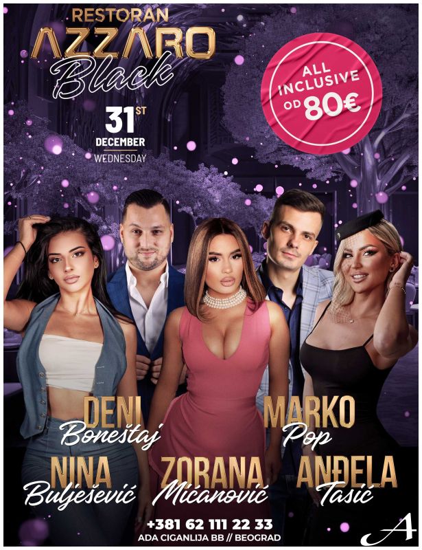 Azzaro Black Club priprema nezaboravan doček Nove godine 2026 u svom prepoznatljivom stilu - punom elegancije, glamura i vrhunske zabave. Na jednoj od najlepših lokacija u Beogradu, u srcu Ade Ciganlije, očekuje vas veče ispunjeno muzikom, emocijama i energijom koja traje do jutra.