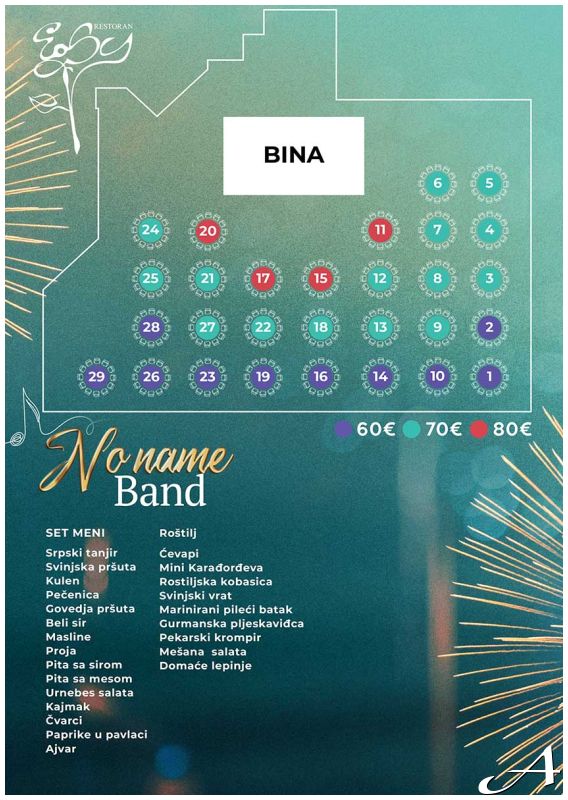 od 60€ do 80€ u zavisnosti od pozicije stola u samoj sali i uključuje elegantno mesto za sedenje, kompletnu večeru i neograničenu konzumaciju alkoholnih i bezalkoholnih pića tokom cele večeri.