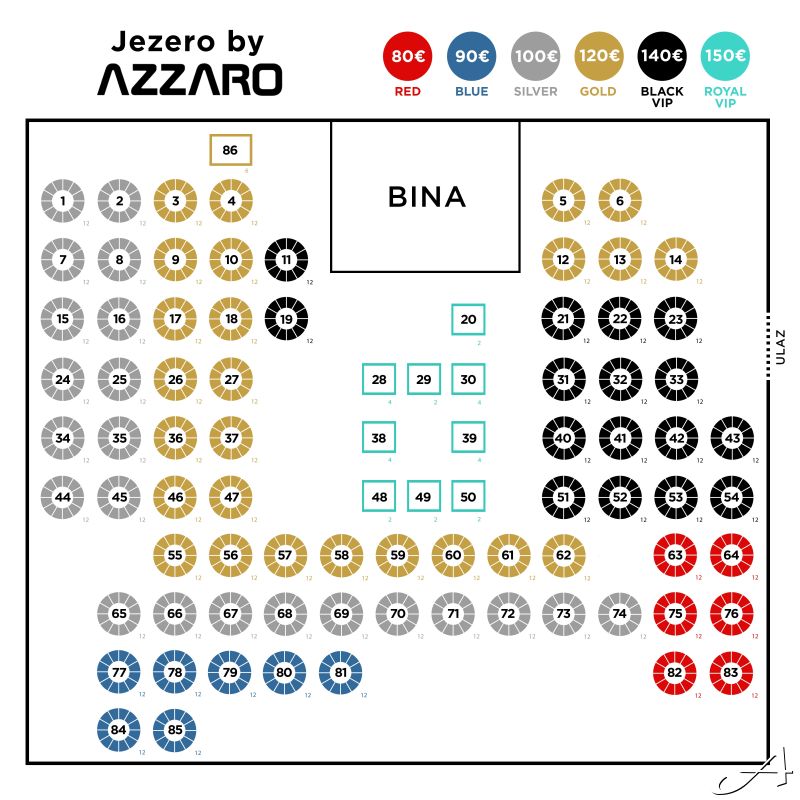 Red zone - 80€ Blue zone - 90€ Silver zone - 100€ Gold zone - 120€ Black VIP - 140€ Royal VIP zone - 150€