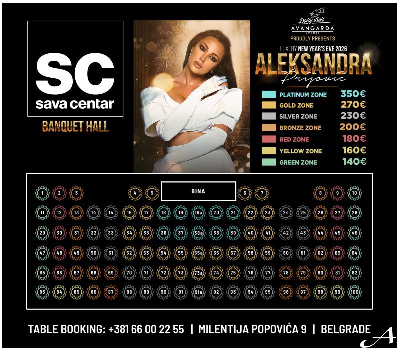 Banquet Hall Sava Centra biće ove godine domaćin jednog od najglamuroznijih dočeka Nove godine u Beogradu, uz nastup jedne od najtraženijih muzičkih zvezda regiona - Aleksandre Prijović. Publiku očekuje veče puno emocija, energije i nezaboravne muzike u luksuznom prostoru koji odiše elegancijom i modernim stilom.