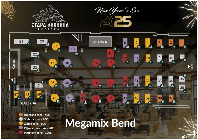 Cene ulaznica: - Bronzana zona - 60€ Podrazumeva mesto za banket svečanim stolom. All-inclusive konzumacija hrane i pića prema novogodišnjem meniju - Srebrna zona - 70€ Podrazumeva mesto za banket svečanim stolom. All-inclusive konzumacija hrane i pića prema novogodišnjem meniju - Zlatna zona - 80€ Podrazumeva mesto za banket svečanim stolom na savršenoj poziciji. All-inclusive konzumacija hrane i pića prema novogodišnjem meniju - Dijamantska zona - 90€ Podrazumeva mesto za banket svečanim stolom na premijum poziciji. All-inclusive konzumacija hrane i pića prema novogodišnjem meniju - Platinum zona - 100€ Podrazumeva mesto za banket svečanim stolom na prestižnoj poziciji u neposrednoj blizini muzike. All-inclusive konzumacija hrane i pića prema novogodišnjem meniju