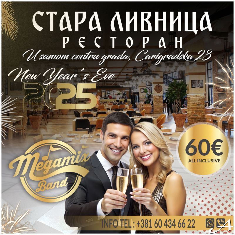 Pridružite nam se u najluđoj noći koje počinje izvrsnim gastronomskim iskustvom u restoranu Stara livnica, koje postaje još lepše kada se, uz izvrsno vino i kvalitetan muzički program Megamix benda, nazdravi životu i svim njegovim bojama.