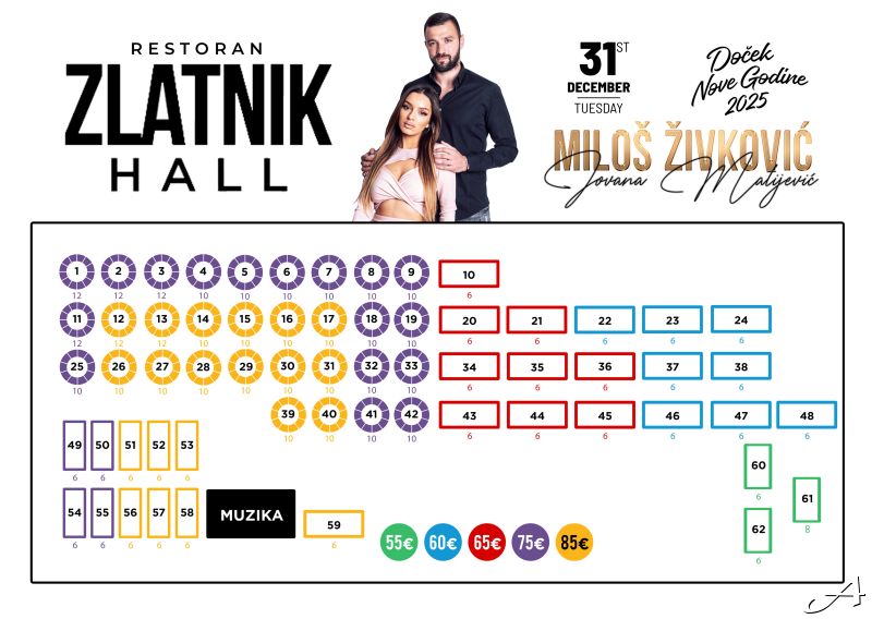 Cena po osobi se kreće od 55€ do 85€ u zavisnosti od pozicije stola u samoj sali i uključuje svečano banket sedenje, neograničenu konzumaciju alkoholnih i bezalkoholnih pića predviđenih ponudom i kompletnu svečanu večeru! (vidi na mapi). U ponudi nemamo barske stolove!