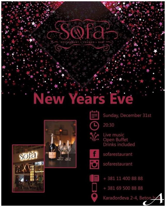 Dočekajte Novu godinu u ekskluzivnom ambijentu restorana Sofa uz muziku, vrhunsku hranu i najkvalitetnija pića!Sofa je restoran osnovan sa idejom da objedini sve ono što jedan restoran treba da poseduje - dobru lokaciju, prijatan i udoban ambijent, uslužno i nasmejano osoblje ali ono najvažnije od svega - vrhunsku hranu.