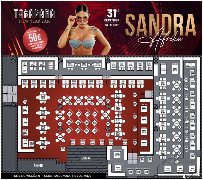 Beograd i Nova godina, kombinacija koja uvek obećava spektakl, a kada se tome doda energija koju donosi Klub Kafana Tarapana, rezultat je noć o kojoj se priča mesecima. Doček 2026. godine u Tarapani biće prava muzička eksplozija uz harizmatičnu Sandru Afriku, pevačicu poznatu po svom scenskom šarmu, hitovima i nastupima koji podižu celu salu na noge.