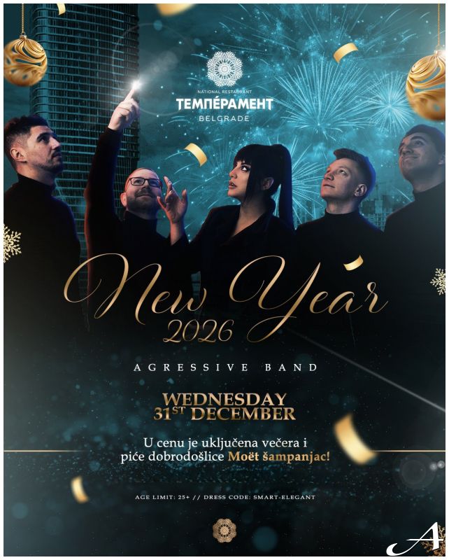 Atmosferu će dodatno podići Agressive band, čiji nastupi uvek garantuju pun plesni podijum i provod koji traje do ranih jutarnjih sati. Njihova energija i širok repertoar savršeno se uklapaju u stil restorana Temperament, gde je svaki događaj obojen dobrim raspoloženjem i ljubavlju prema Beogradu.