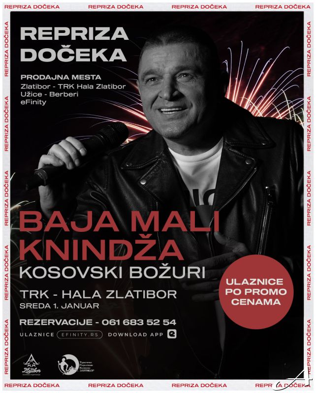 ]Baja Mali Knindža i Kosovski božuri Kada se pomene ime ]Baje Malog Knindže, prva asocijacija je autentična narodna muzika koja povezuje generacije. Publika će uživati u pesmama koje se pevaju iz srca, a ritam će vas naterati da igrate do kasno u noć.