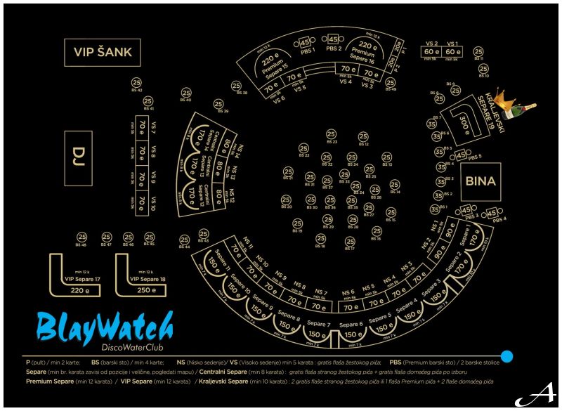 VIP separe separe, Premium separe i Kraljevski separe dobijaju 2 flaše stranog žestokog pića po izboru (Johnnie Walker, Ballantines, Smirnof, Tekila, Jegermaister..) ili 1 flašu Premium pića po izboru (Moet, Grey goose vodka, Chivas regal, Jack Daniels...) + 2 flaše domaćeg pića po izboru.