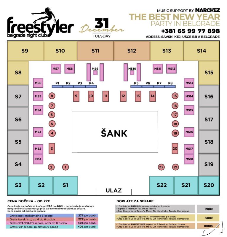 gosti koji budu prisustvovali dočeku Nove Godine se potpuno mogu prepustiti čarolijama i iskustvu menadžmenta poznatog kluba koji obećava da ćete doživeti noć za pamćenje i dočarati vam kako izgleda vrhunac beogradskog klabinga.Splav Freestyler se nalazi na najpopularnijem mestu za provod, na Savskom keju u ulici Ušće BB.