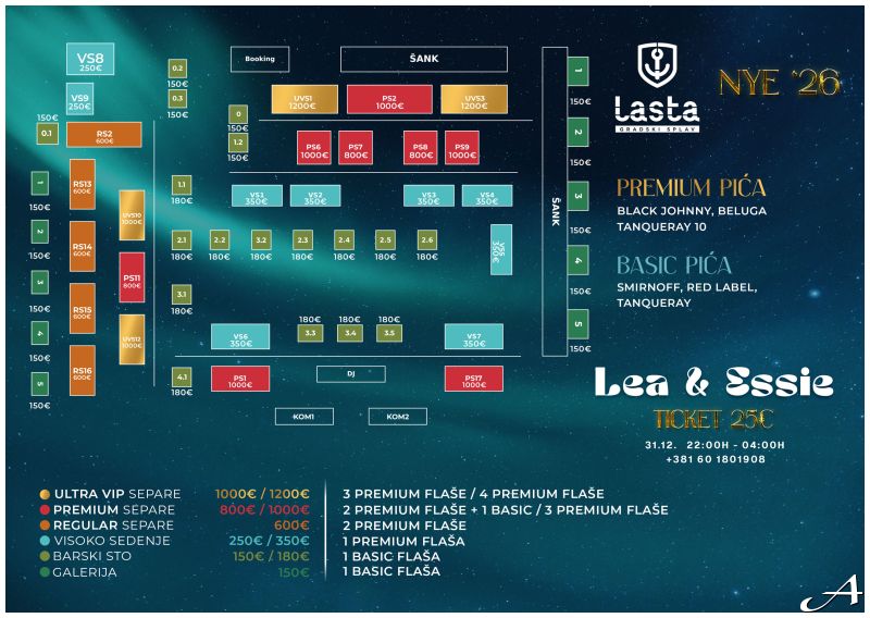 Galerija - 150€ (u cenu uključena basic flaša žestine) Barski sto - 150€/180€ (u cenu uključena basic flaša žestine) Visoko sedenje - 250€/350€ (u cenu uključena premium flaša žestine) Regular separe - 600€ (u cenu uključene 2 premium flaše žestine) Premium separe - 800€/1000€ (u cenu uključene 2 premium flaše žestine + 1 basic flaša žestine / 3 premium flaše žestine) Ultra VIP separe - 1000€/1200€ (u cenu uključene 3 premium flaše žestine / 4 premium flaše žestine)