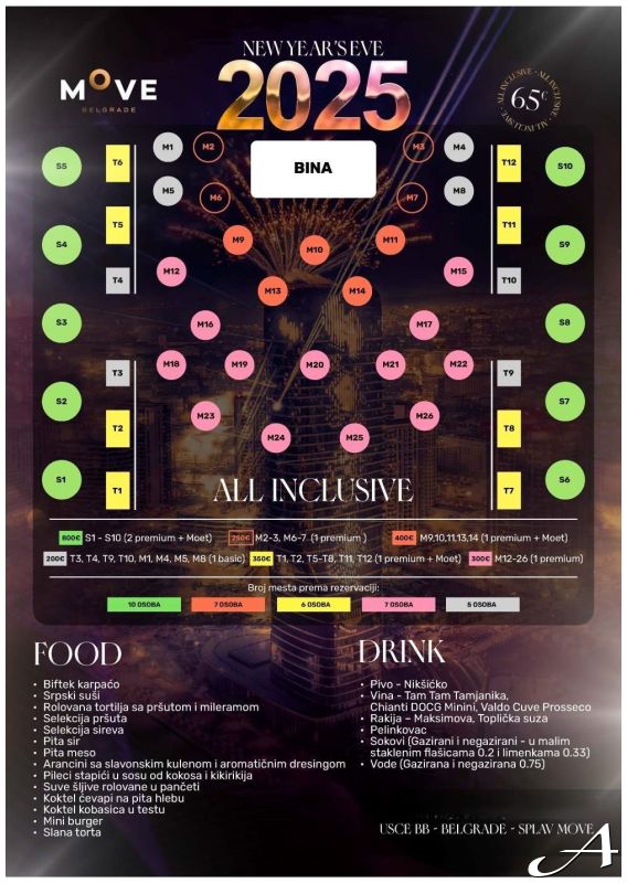 Rezervacije se doplaćuju po grupnom sistemu i različitih su cena u zavisnosti od pozicije u lokalu, kao i komoditeta i ponude: S1, S2, S3, S6, S7, S8 - 600€, minimum je potrebno 10 karata za tu rezervaciju, uključuje 2 flaše premium žestine + Moet S4, S5, S9, S10 - 800€, minimum je potrebno 10 karata za tu rezervaciju, uključuje 2 flaše premium žestine + Moet M2-3, M6-7 - 250€, minimum je potrebno 7 karata za tu rezervaciju, uključuje 1 flašu premium žestine M9,10,11,13,14 - 400€, minimum je potrebno 7 karata za tu rezervaciju, uključuje 1 flašu premium žestine + Moet T3,T4,T9,T10,M1,M4,M5,M8 - 200€, minimum je potrebno 5 karata za tu rezervaciju, uključuje 1 flašu basic žestine T1,T2,T5-T8,T11,T12 - 350€, minimum je potrebno 6 karata za tu rezervaciju, uključuje 1 flašu premium žestine + Moet M12-26 - 300€, minimum je potrebno 7 karata za tu rezervaciju, uključuje 1 flašu premium žestine