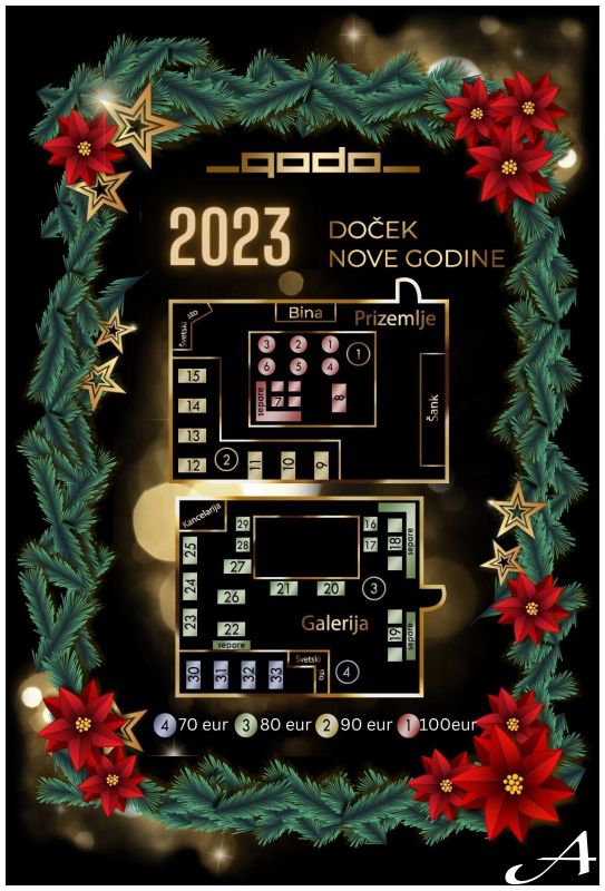Cena po osobi se kreće od 70€ do 100€ u zavisnosti od pozicije stola u samoj sali i uključuje elegantno mesto za sedenje, kompletnu večeru i neograničenu konzumaciju alkoholnih i bezalkoholnih pića tokom cele večeri (vidi na mapama).