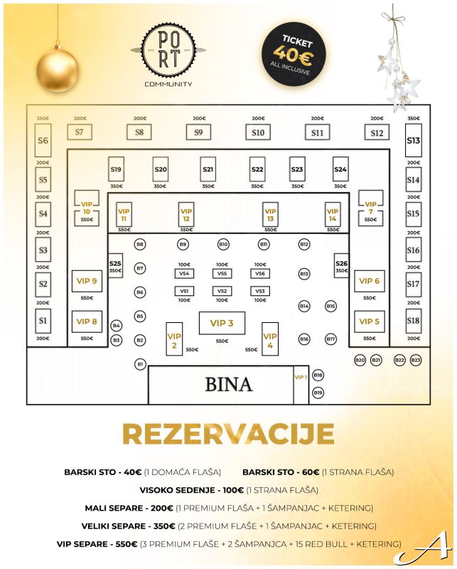 Cena rezervacija: - Barski sto - 40€ (sa flašom domaćeg pića) - Barski sto - 60€ (sa flasom stranog pića)